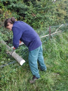 A 18hr, Mathias est retourne et a expliqué que on a doit à l’orchade quand on est allée lundi. Il y a les moutons et les chèvres qui mange la grasse. We had to move their enclosure so they could graze on a new patch of grass. Aussi, une broche est tombée sur la fence pour une enclosure pour les chèvres donc Nathaniel et moi essayait sawing the branch in half.