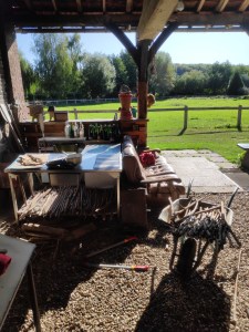 I led the calmer one and I think I did a good job – I guess it helped that she was so tame. But on the way, she kept stopping to chomp on the grass, but when this happened, I had to firmly command her to continue – in French of course. She doesn’t speak English. We returned to the farm at 10hr. The next job was to move all of the sticks, we had laid out to dry, into the furnace thingy to make cider.
