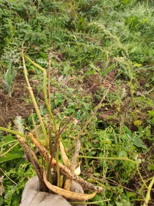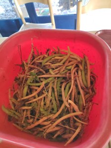 After I fed the rabbits (and myself) and swept the barn, Matthias and I cycled to his vegetable garden and we spent the morning collecting runner beans.