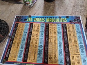 He explained that when Oceane and her sister were younger, he would quiz them using this mat. I confessed that I hate irregular verbs as they’re so difficult to conjugate. Also, they usually form any exception to grammar rules. Matthias said that French grammar is simpler than English grammar. In English, you don’t have regular or irregular verbs, neither do you have a formal/informal you.