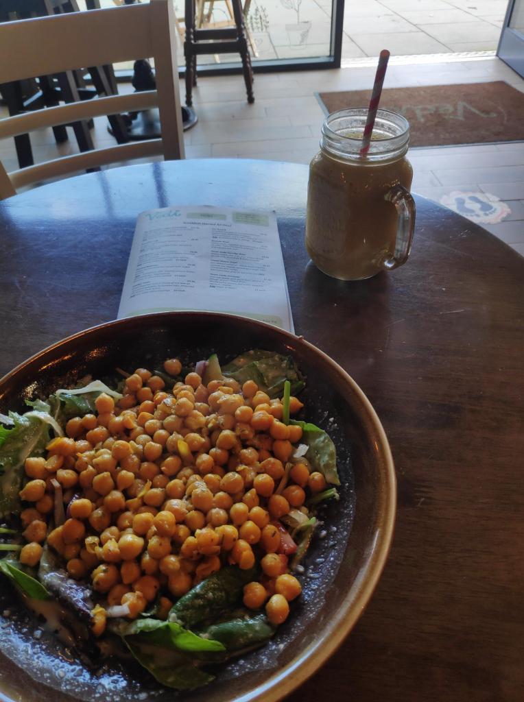 On my way to the Derbion, I spotted a vegan Indian cafe, so I headed there for lunch. In retrospect, I should have gone to the food court. Not only did the cafe not have the jacket potato or soup, which suited me, but it also didn’t have the Vede roti wraps or the veg curry of the day. In a panic, I went for the chickpea salad bowl. (Insert picture) As the name suggests, it was chickpeas and salad. A little simplistic, bland and not all that filling. But the mango, pineapple and apple smoothie was nice though.