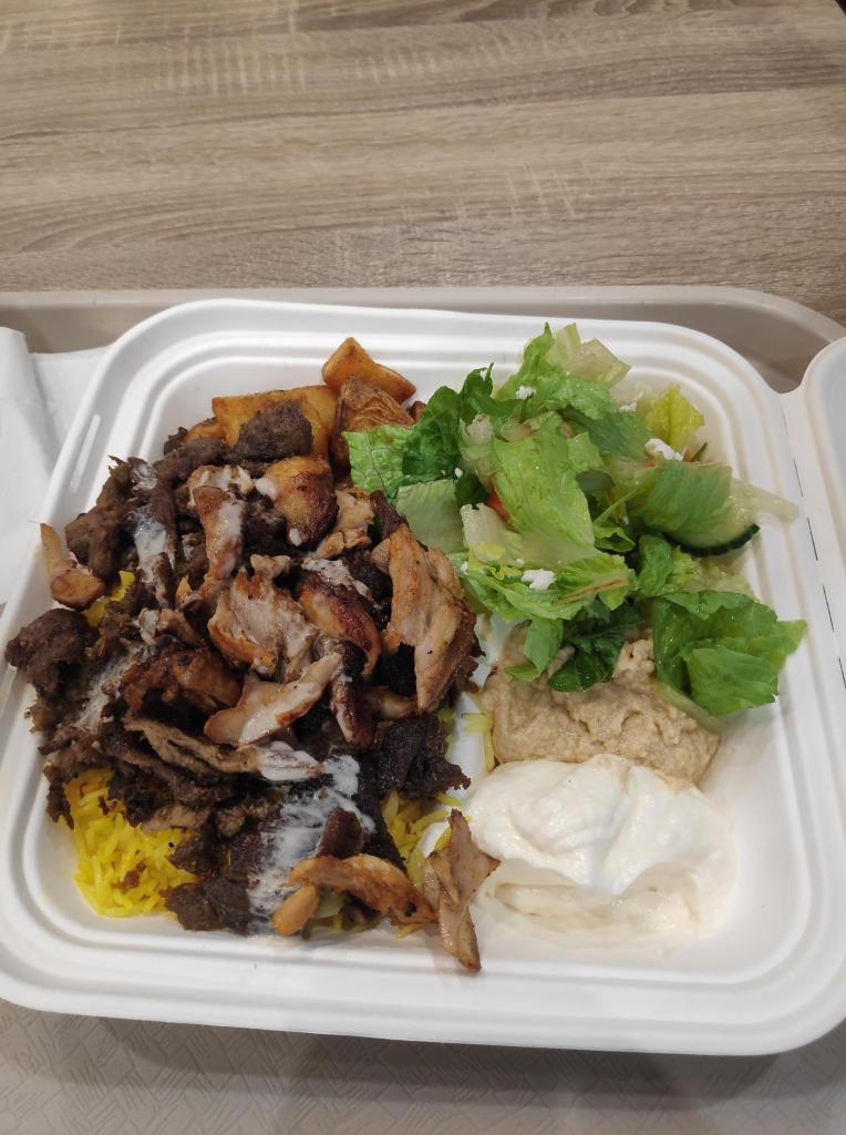 I returned to the food court in the Derbion and ate a Mediterranean platter – chicken, beef, rice, potatoes, couscous, salad. It was a lot to eat – a bit dry, but very filling. I finished at 5.50 and it was time to head home, so I headed to the station for my half six train back in London.