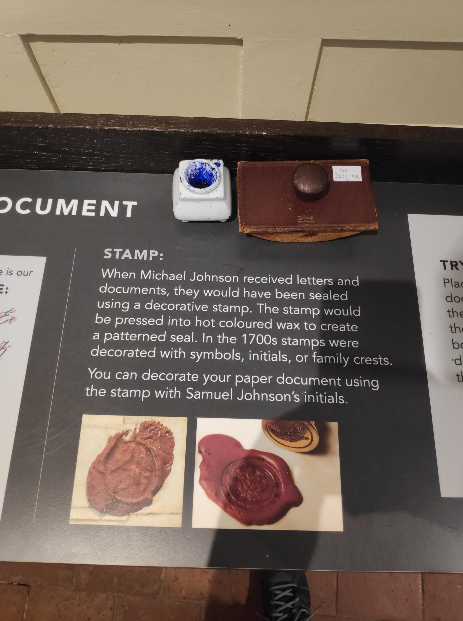 I also found that Johnson was married to a cougar with his wife Elizabeth being twenty years older than him when they wedded. Johnson was also a book-binder so there was a room exhibiting his equipment. You even had the chance to write with a feathered quill and ink. I liked to do that a lot when I was younger.