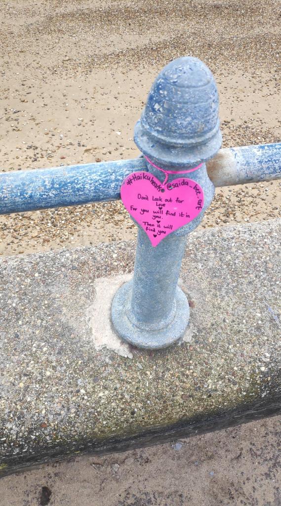 While I was considering things, I headed back to the seafront, but walked in the opposite direction to before. I spotted the city’s WW2 memorial – “Lest we Forget-” we should never forget their sacrifice. And I also spotted this haiku written on a heart-shaped label.