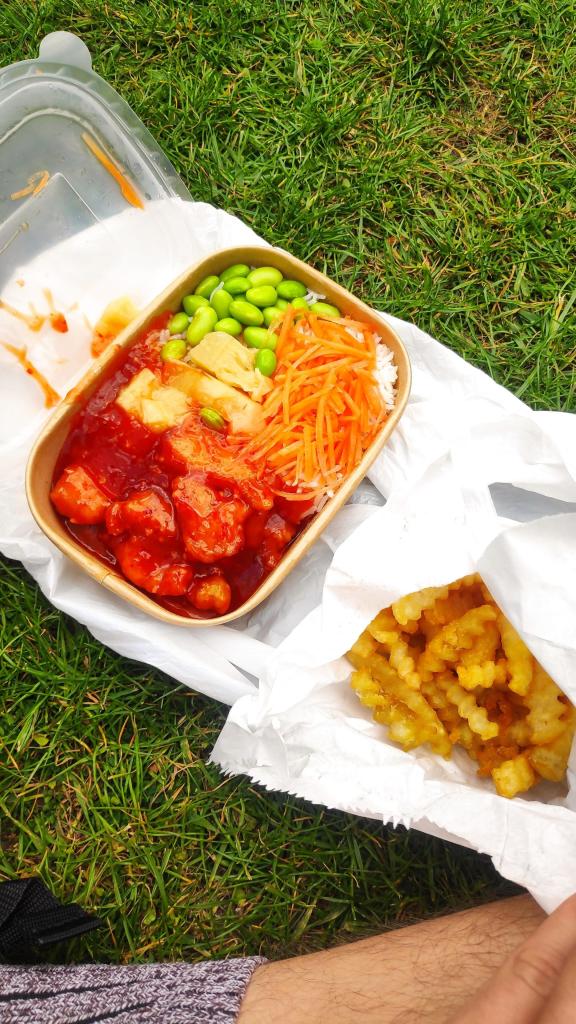Although my attempts to explore churches were a fail this killed enough time for Go Bento to be open upon my return. I bought a Sweet Chilli Chicken bento and chips for £6.
