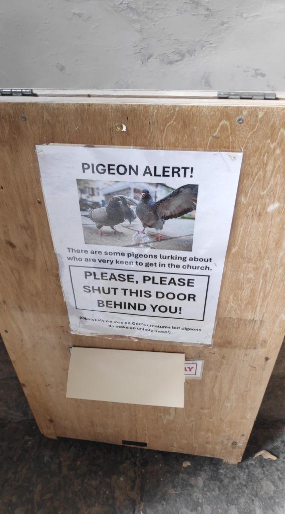 Upon leaving the church, I saw a warning about pigeons as well as aliens harvesting the sun. Which aliens I wonder? Nordics? Insectoids? Avians?