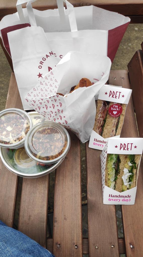 By now it was four and my thoughts turned to dinner tonight/lunch tomorrow. It was time for Too Good To Go, which I fulfilled at the local pret a manger. After I picked up my haul, I went to examine it at the cathedral. (I told you I would come back.) Alas, it had closed for the day. I had to inspect my haul outside.