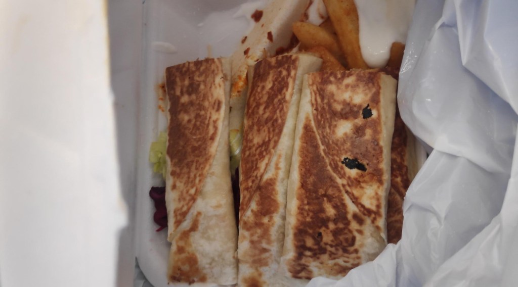 I went to the Bake – a new (for me at least) a Lebanese style grill where for £7 I got a big tray of chicken rolls, chips and salad. Not that I knew that at the time, as there was nowhere convenient to check my haul. But at least it was £7 and not The £21 it would have been originally.